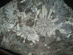 菊花石の「花」の正体は、主に放射状に成長した鉱物結晶です。根尾谷産の場合、多くは石灰岩や粘板岩などの堆積岩中に生成した方解石(カルサイト)の結晶集合が核になっています。